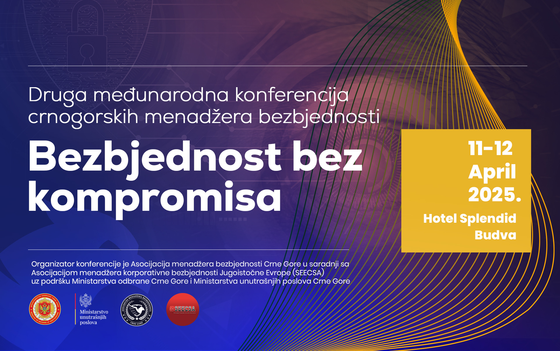 Asocijacija menadžera bezbjednosti Crne Gore u saradnji sa Asocijacijom menadžera korporativne bezbednosti Jugoistočne Evrope (SEECSA) organizuje Drugu Međunarodnu konferenciju crnogorskih menadžera bezbjednosti „Bezbjednost bez kompromisa“, koja će se održati 11. i 12. aprila 2025. godine u hotelu “Splendid” u Budvi.